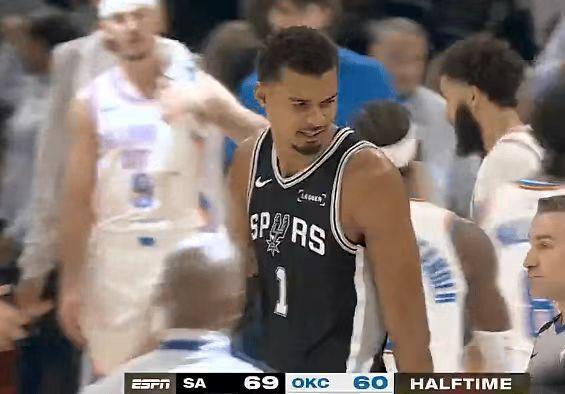 次節(jié)比賽,雙方進(jìn)攻火力下滑,兩隊(duì)第二節(jié)均是單節(jié)不足30分。馬刺在第二節(jié)中段被追到僅51-45領(lǐng)先6分優(yōu)勢,文班亞馬防守端給力表現(xiàn),??怂箘t是進(jìn)攻端攻傳結(jié)合,引領(lǐng)馬刺逐步擴(kuò)大63-49領(lǐng)先14分優(yōu)勢。馬刺之后擴(kuò)大69-55領(lǐng)先優(yōu)勢,雷霆連追5分,馬刺單節(jié)28-24再贏4分,上半場比賽結(jié)束馬刺69-60領(lǐng)先雷霆。