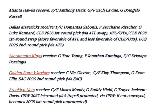 戴維斯加盟老鷹的交易不僅有可能達(dá)成,甚至可能演變成一場涉及多支球隊(duì)的重磅交易。Sigele列出了一筆涉及老鷹、獨(dú)行俠、國王、勇士和籃網(wǎng)的五方交易:戴維斯奔赴亞特蘭大,特雷-楊、扎克-拉文、小薩博尼斯、克萊、庫明加等多位球星也將牽涉其中。