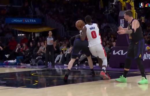 在這個回合中,活塞中鋒杜倫碾著拉拉維亞強(qiáng)突籃下,此時在側(cè)翼站位的東契奇并沒有選擇協(xié)防,只是目送杜倫攻筐,并攤開雙手示意裁判杜倫進(jìn)攻犯規(guī)。最終裁判未予吹罰,杜倫順利得分。