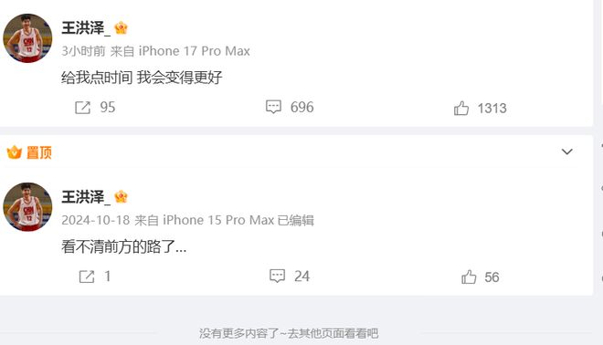 王洪澤現(xiàn)在的問題主要是在心理層面,和賽季初相比,現(xiàn)在的小王出手沒有了自信,不敢投三分,內(nèi)線對上比他高一點的老將就對抗不上,關于這個問題,王洪澤其實也意識到了,賽后他罕見的在個人社媒上發(fā)文勉勵自己:給我點時間,我會變得更好(王洪澤一直很低調(diào),很少發(fā)文,這是他個人職業(yè)生涯的第二條動態(tài))。